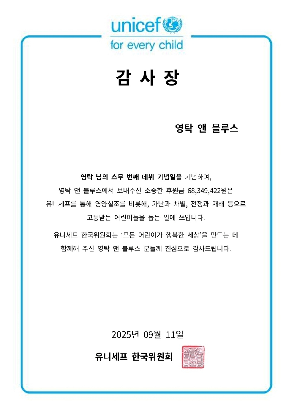 영탁 공식 팬클럽 영탁앤블루스(youngtak&blues)는 '영탁 데뷔 20주년 기념 릴레이'를 진행해 모은 성금 6834만 9422만 원을 11일 유니세프 한국위원회에 기부했다.