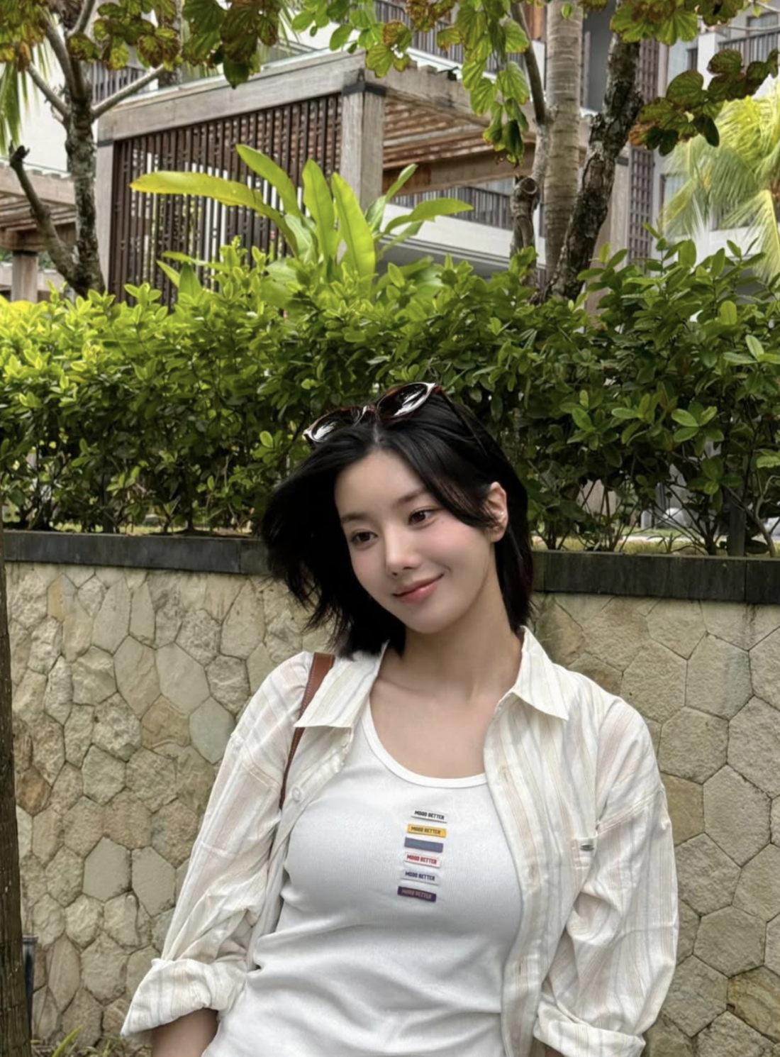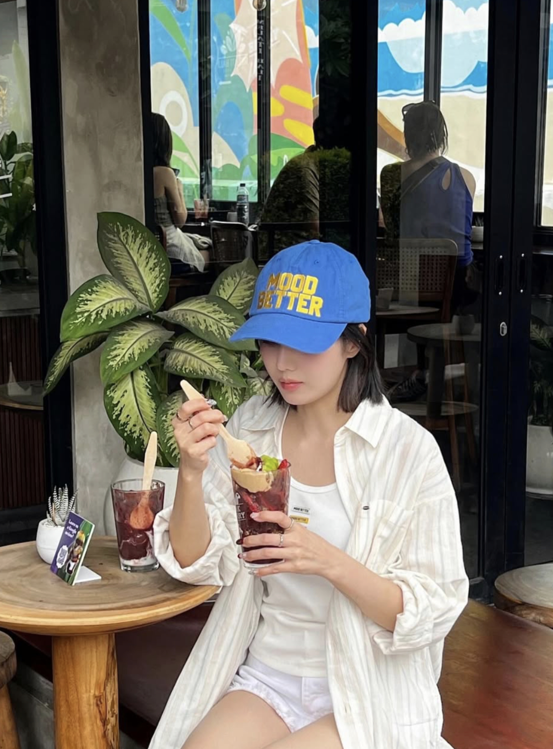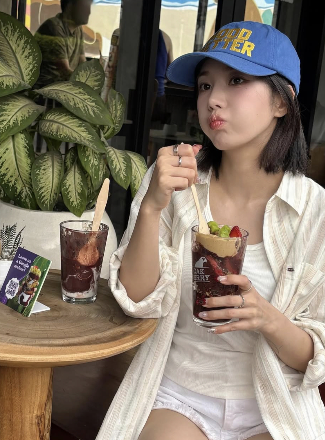 또 다른 사진에서는 카페에서 음식을 손에 들고 파란 모자를 눌러쓴 채 입을 쭉 내민 새침한 모습으로 눈길을 끌었다. 휴양지에서 한껏 여유를 만끽하는 모습이 팬들의 부러움을 자아냈다.