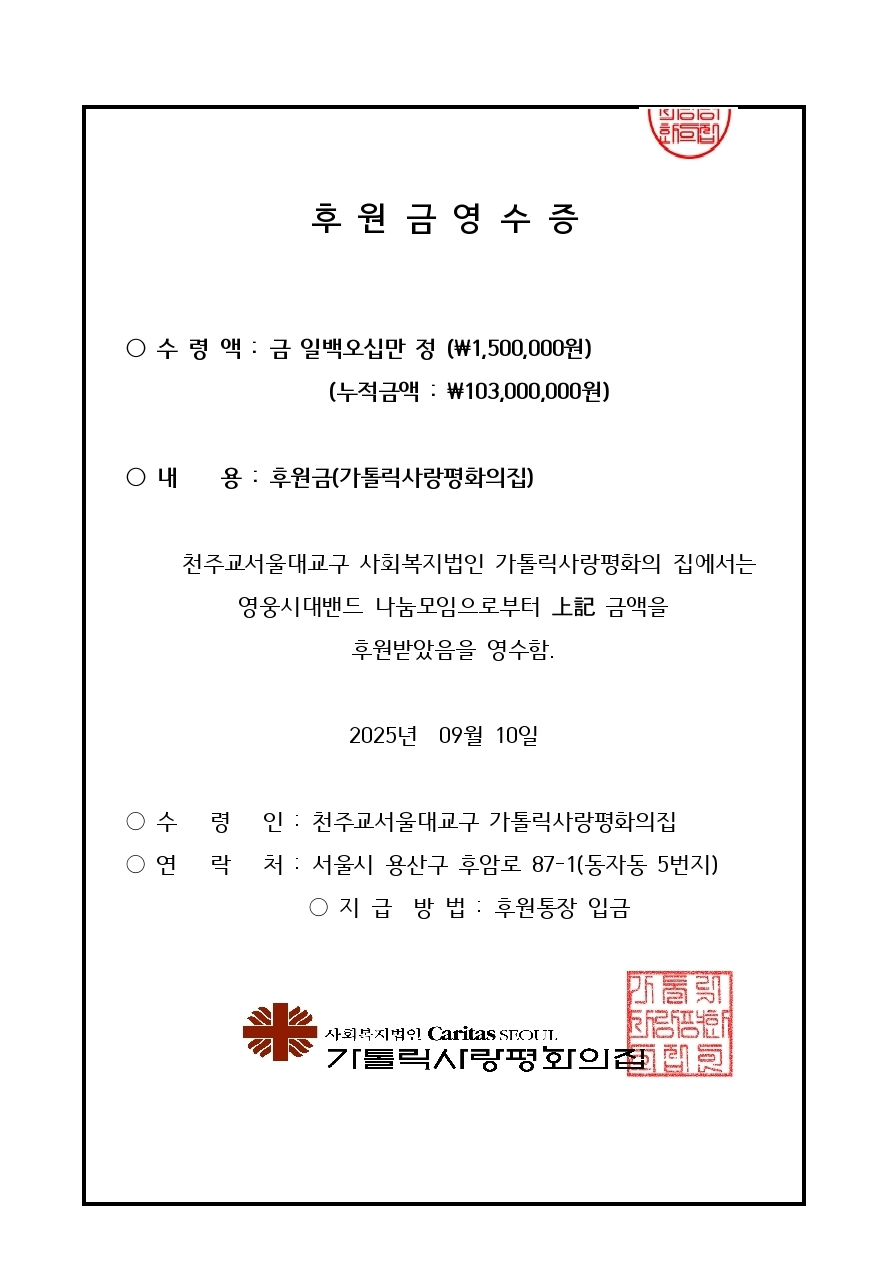 '영웅시대밴드(나눔 모임)'은 2020년 5월부터 매월 150만 원 상당의 도시락 재료비를 기부하고, 둘째 주 목요일마다 조리와 배달 봉사를 했다. 올해 9월까지 가톨릭사랑평화의집에서만 총 77차례 봉사했고, 누적 후원금은 1억 원을 넘어섰다.