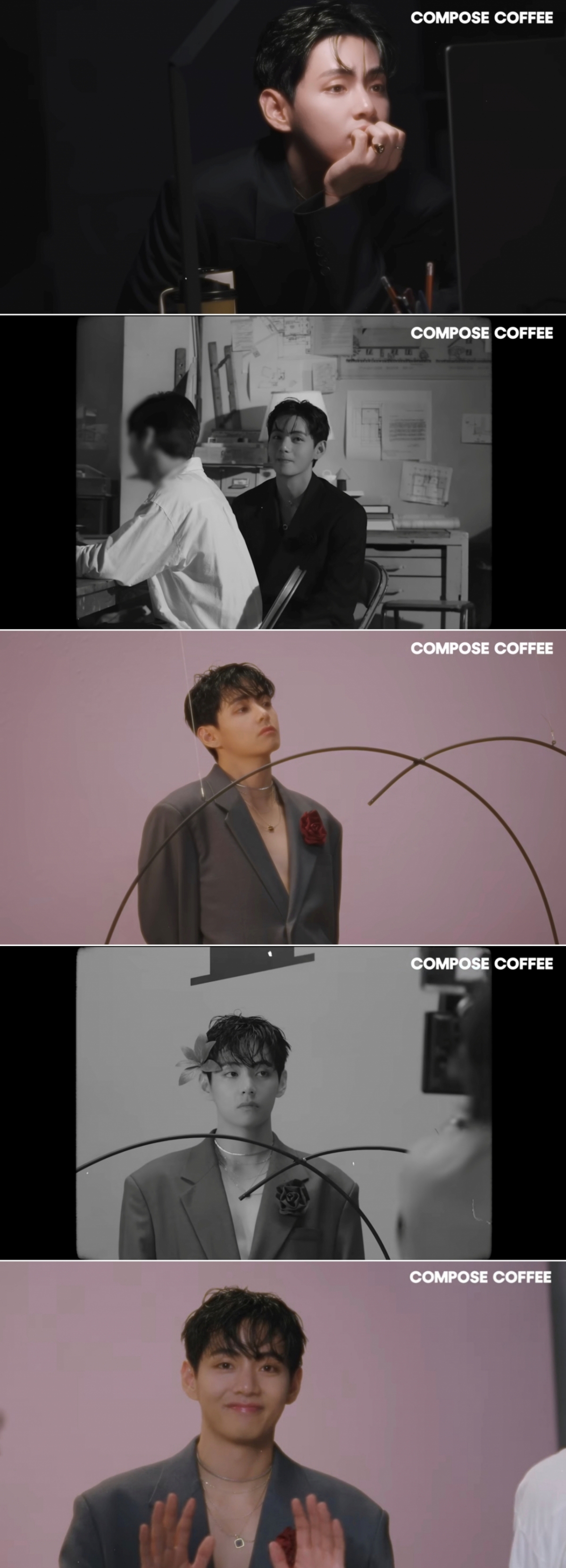 방탄소년단(BTS) 뷔가 홍보모델로 활동하고 있는 컴포즈커피 광고촬영 비하인드 영상을 통해 매력을 발산했다.