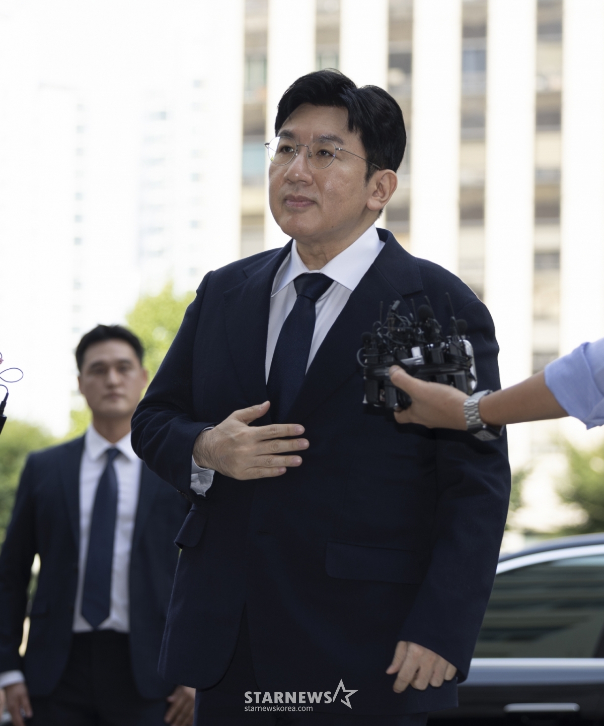 "이익 목적으로 계획한 거 맞으십니까?", "사모펀드와 공모하셨어요?"라는 질문도 이어졌지만 방 의장은 묵묵부답으로 일관하면서 경찰청으로 들어갔다.
