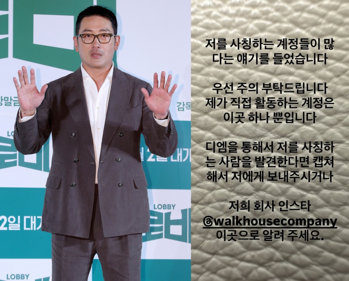 배우 하정우가 사칭 SNS에 대해 주의를 당부했다.