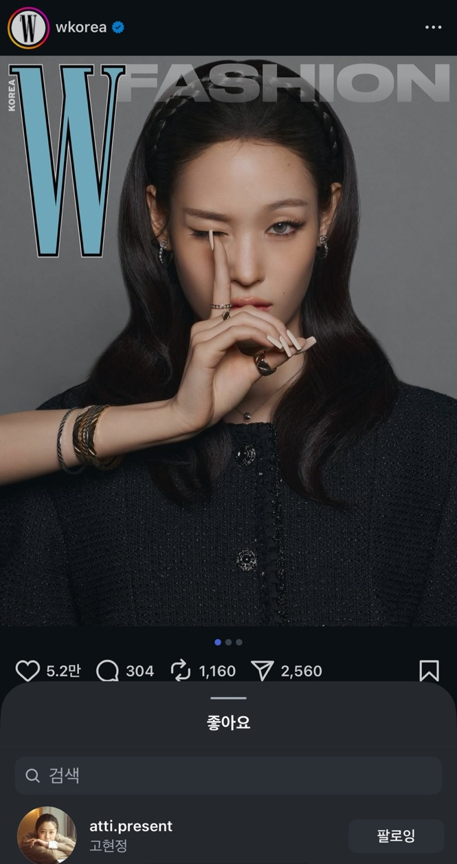 15일 각종 온라인 커뮤니티 게시판엔 고현정이 애니의 화보에 '좋아요'를 클릭한 사실이 알려져 뜨거운 화제를 모았다. 이는 11일 패션 매거진 W 코리아 공식 SNS에 게재된 화보이다.