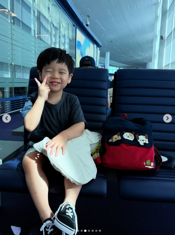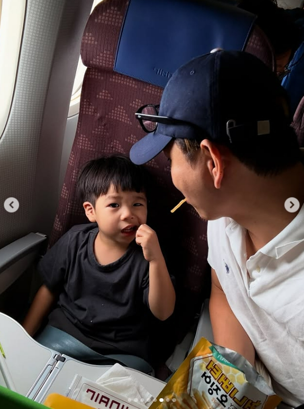 사진 속 제이쓴은 아들의 어린이집 가방을 들고 인천국제공항에서 행복한 미소를 짓고 있는 모습. 두 사람은 기내에서 과자를 먹으며 갑자기 떠난 해외여행에 잔뜩 설렌 표정을 숨기지 못하고 있다.