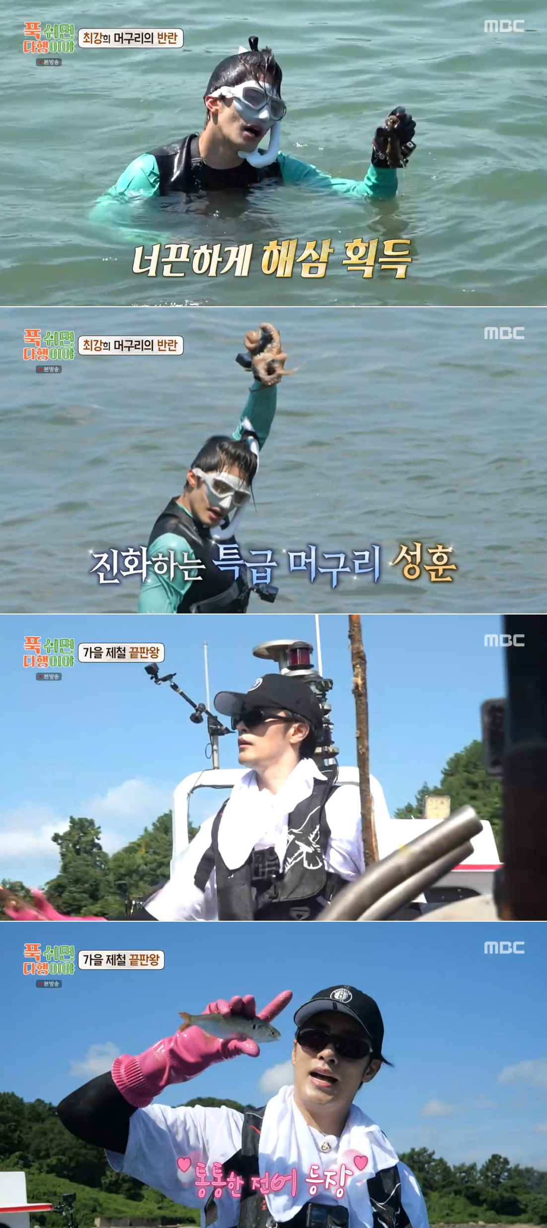 지난 15일 방송된 MBC 예능 '푹 쉬면 다행이야' 65회에서 성훈은 최강희, 박준형, 양치승과 함께 무인도 손님맞이를 위한 식재료 사냥에 나섰다. 그는 40분 가까이 잠수, 손 감각만으로 소라와 전복, 돌멍게를 낚아챘다. 또한 깊은 수심 속 문어도 제압했다.