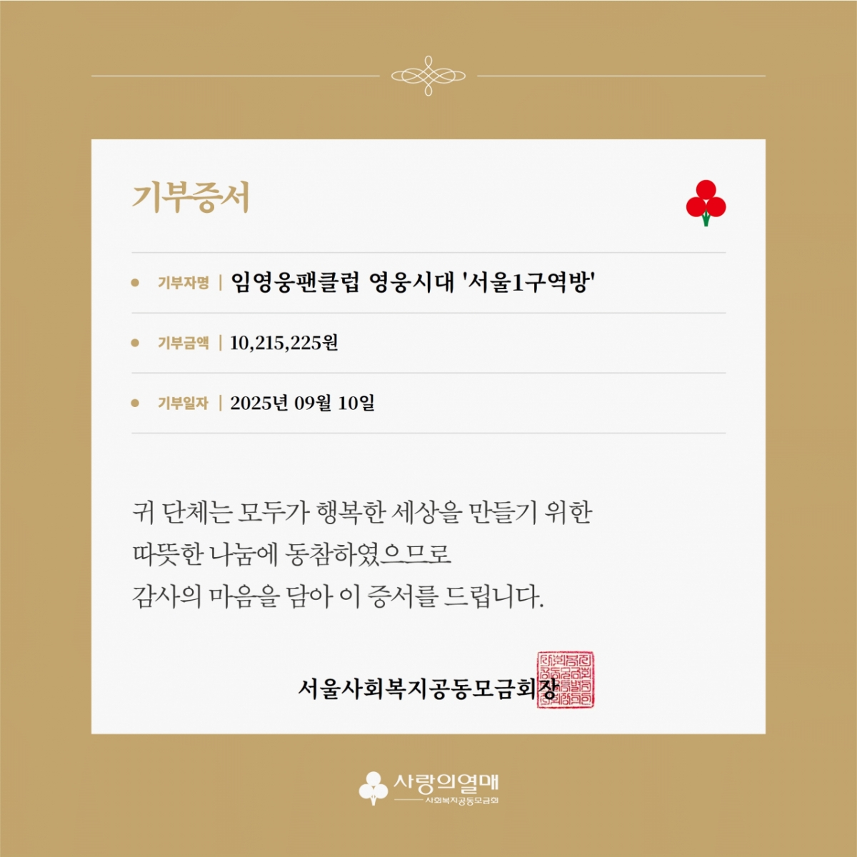 17일 서울 사회복지공동모금회(이하 서울 사랑의열매, 회장 김재록)에 따르면, 임영웅 정규 2집 앨범 발매를 기념해 임영웅 팬클럽 '영웅시대 서울1구역'은 9월 10일 1021만 5225원을 기부했다.
