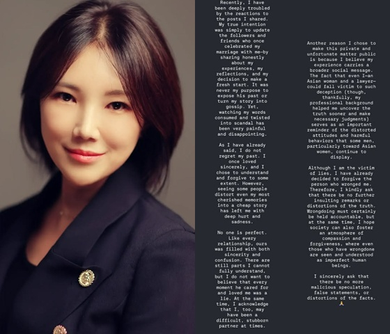 제가 이 사적인 일을 공개적으로 알린 또 다른 이유는, 이 경험이 단순한 개인사가 아니라 사회적 경각심을 불러일으킬 수 있다고 믿었기 때문입니다. 아시아 여성이자 변호사인 저조차도 이런 피해를 입을 수 있었다는 사실(다행히 전문가로서 빠른 시점에 진실을 파악할 수 있었지만)은, 일부 남성들의 왜곡된 태도와 행태를 돌아보게 하는 중요한 사례가 될 수 있습니다.