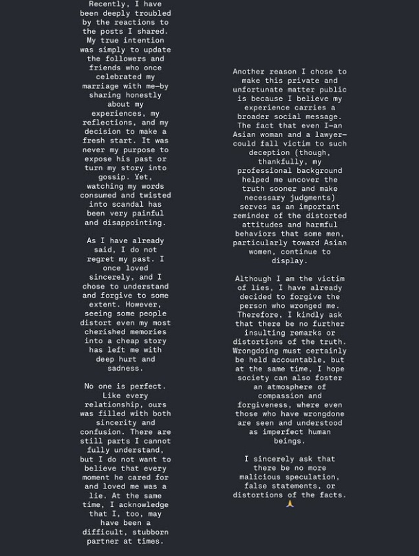 이어 "저는 이 충격적인 사실들을 2024년 12월, 세 번의 화려한 결혼식을 모두 마친 뒤에야 하나씩 알게 됐다. 그가 제가 믿고 사랑하던 사람이 아님을 알게 됐지만, 여전히 그를 사랑하는 마음으로 용서하며 가정을 지키려 최선을 다했다. 그러나 그는 전혀 달라지지 않았고, 오히려 시간이 갈수록 욕설과 모욕적인 태도로 저를 괴롭혔다. 심지어 제가 사고로 병실에 누워 있을 때조차 '드라마 퀸'이라 비웃는 그의 모습에서, 저는 더 이상 희망이 없음을 깨달았다"고 전했다.