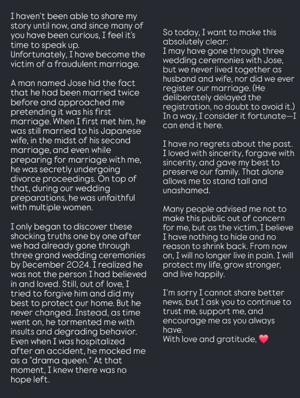 그는 "호세라는 남자는 자신의 두 번의 결혼 사실을 숨기고 저에게 초혼인 것처럼 접근했다. 내가 그를 처음 만났을 때 그는 이미 일본인 아내와 두 번째 결혼 생활 중이었으며, 결혼을 준비하던 과정에서도 몰래 이혼 소송을 진행하고 있었다. 심지어 저와 결혼 준비를 하면서도 여러 여자들과 부정을 저질렀다"고 했다.
