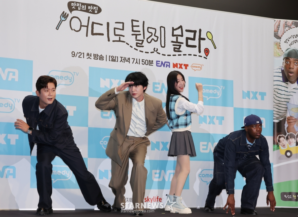 김대호, 안재현, 쯔양, 조나단이 19일 오전 서울 마포구 상암동 스탠포드호텔에서 진행된 ENA 예능 '어디로 튈지 몰라' 제작발표회에 참석해 포즈를 취하고 있다.