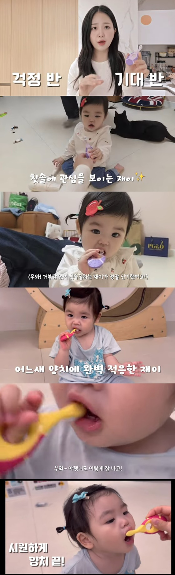 방송인 박수홍의 딸 재이 양이 첫 양치질에 성공했다.