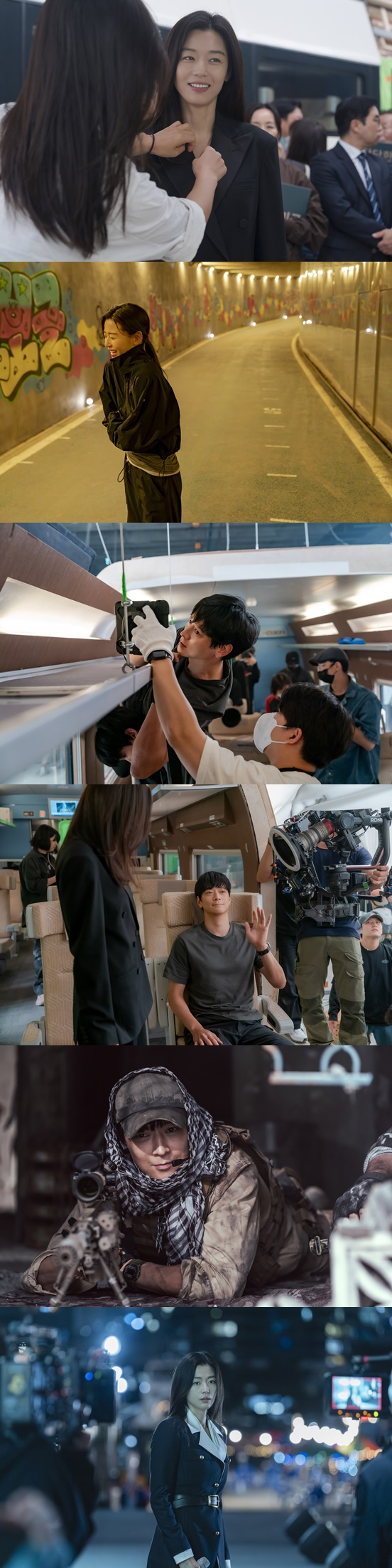 공개된 비하인드 스틸은 긴장감이 감도는 '북극성' 속 모습과는 또 다른 웃음과 열정이 가득했던 촬영 현장이 담겨 있다. 전지현과 강동원의 역대급 케미스트리로 시청자들의 화제를 모았던 기차 씬 속 화기애애한 모습은 훈훈했던 촬영장 분위기를 고스란히 전한다. 뿐만 아니라, 올곧은 소신을 펼치며 극에 긴장감을 더한 존 조 배우부터 모든 장면마다 빈틈없는 열연으로 시청자들의 몰입을 최고조로 이끈 임옥선 역의 이미숙과 채경신 역의 김해숙 배우까지. 극 중 카리스마 넘치는 모습과 달리 웃음 가득한 밝은 얼굴로 180도 반전 매력을 선보인다. 또한, 화려한 액션을 선보이며 시청자들을 설레게 한 강동원 역시 완벽하게 캐릭터에 녹아들어 열연을 펼치는 열정적인 모습을 엿볼 수 있다. 이처럼 웃음과 열정이 공존했던 <북극성>의 촬영 현장은 등장인물들의 열연과 한시도 눈을 뗄 수 없는 점입가경의 스토리를 더욱 기대하게 한다.