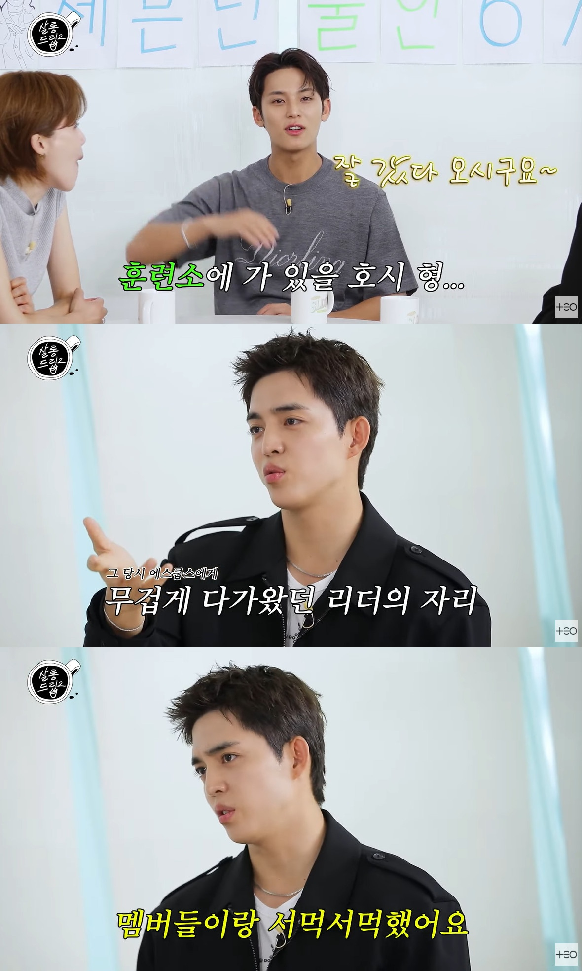 에스쿱스는 리더에 대해 "그냥 나한테는 애들 혼낼 사람 필요하구나 싶었다. 회사에서도 혼내기 싫고 이끌어야 하는 사람이 필요했다. 그래서 난 멤버들과 서먹서먹했다"라고 털어놨다.