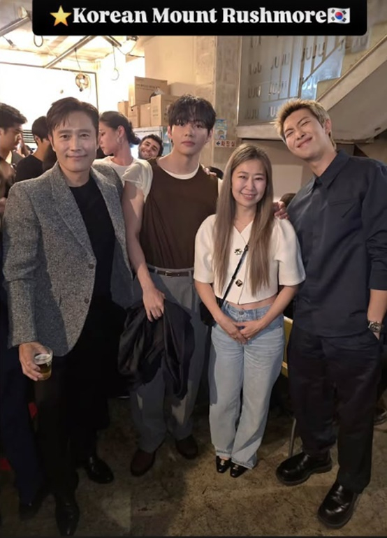 메기강 감독은 24일 자신의 개인계정에 '어쩔수가 없다' 시사회 뒤풀이에서 찍은 사진을 게재했다. 사진 속 메기강 감독은 영화의 주연인 이병헌과 방탄소년단 뷔, RM과 어깨를 나란히 하고 있다.
