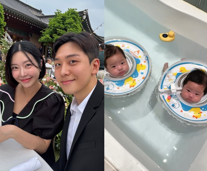 레이디제인은 24일 쌍둥이 딸 우주와 별의 욕조수영 모습이 담긴 영상을 공개했다.