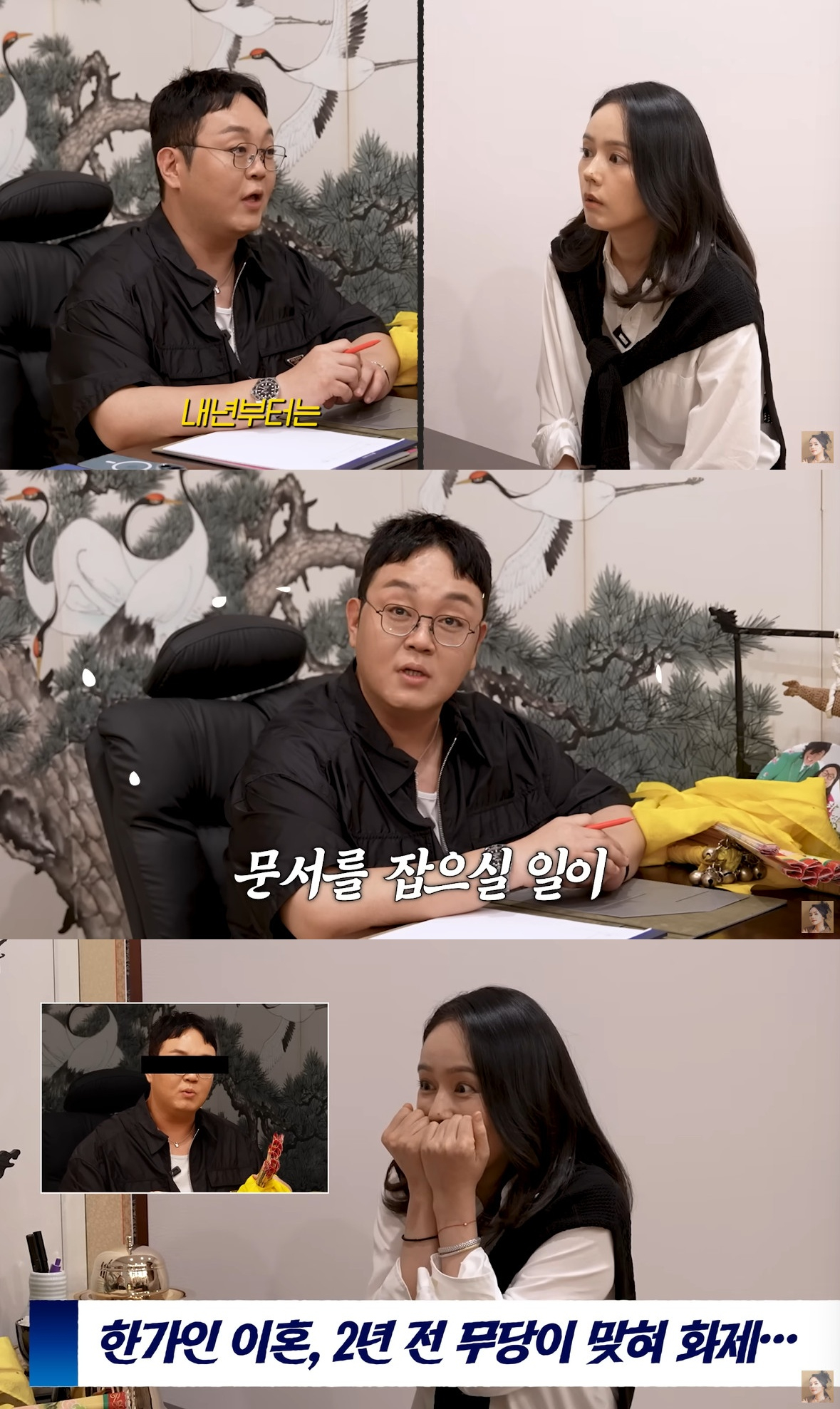 이날 무당은 "내가 만약에 뭘 해야 하는데 싫다면 그냥 안 한다. 아니면 내 것이 아니라고 생각하고 포기한다. 쿨하게 돌아서는 느낌이다. 내가 이렇게 봤을 때 작년이랑 올해가 약간 노력한 느낌이다. 운명적으로 노력해야 한다"라며 "내년부터는 운이 좋고 일이 많다. 드라마나 영화가 많이 들어올 거다. 올해나 내년부터 문서를 잡을 일이 많다. 이사 혹은 건물이다. 근데 가인님이나 정훈님 중 한 분이 문서를 잡아 온다"라고 말했다.