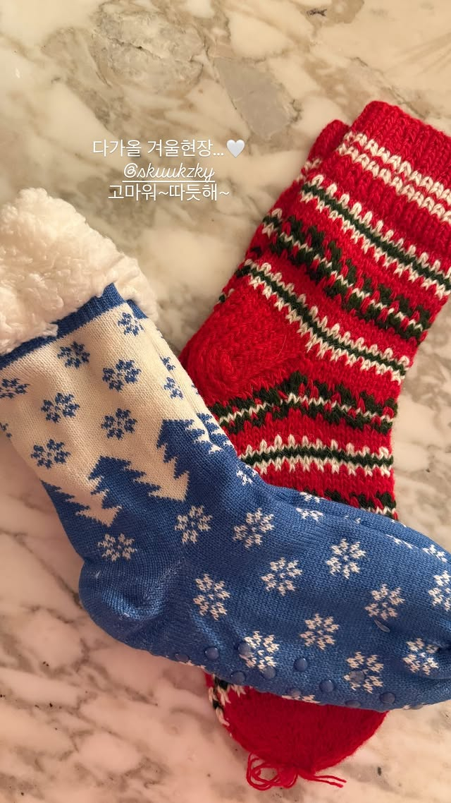 공개된 사진 속에는 두꺼운 겨울 양말 두 켤레가 놓여있다. 이는 겨울을 앞두고 수지가 송혜교에게 선물한 것으로 보이며 송혜교는 "고마워. 따뜻해"라고 고마운 마음을 전했다.
