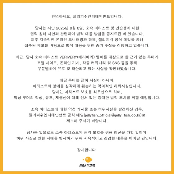 29일 소속사 젤리피쉬엔터테인먼트는 "해당 루머는 전혀 사실이 아니며, 아티스트의 명예를 심각하게 훼손하는 악의적인 허위사실"이라는 입장을 밝혔다.