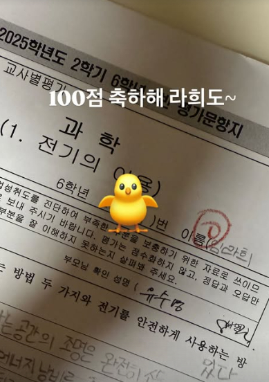 슈는 30일 라희 라율의 6학년 2학기 과학 단원평가 시험지를 게재했다.