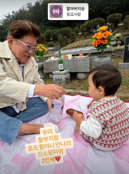 공개된 사진 속에는 추석을 앞두고 성묘에 나선 김용건과 손자의 모습이 담겼다. 김용건은 사랑스러운 눈빛으로 손자를 바라보고 있다. 황보라는 시아버지와 아들의 투샷을 카메라에 담으며 애정을 표현했다.