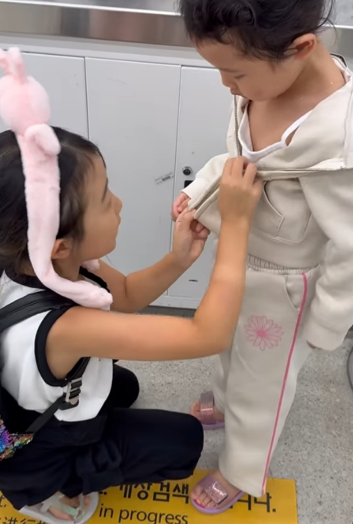 공개된 사진에는 하와이행 비행기에 탑승하기 위해 공항을 찾은 이지혜 가족의 모습이 담겨 있다. 특히 사진 속 이지혜의 첫째 딸 문태리 양은 동생 문엘리 양의 옷 지퍼를 올려주는 등 직접 챙기고 있다.