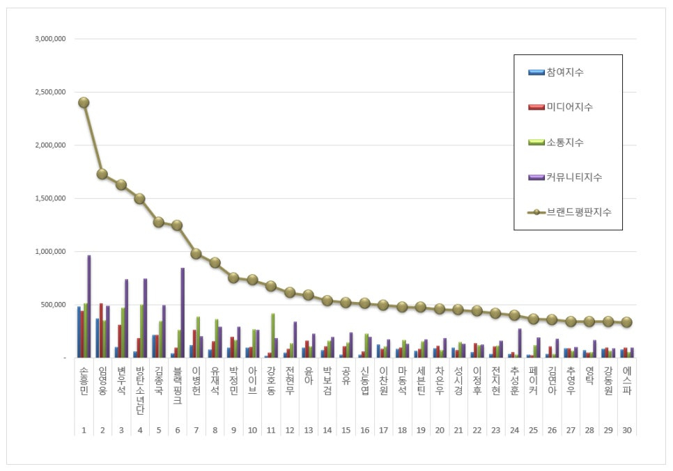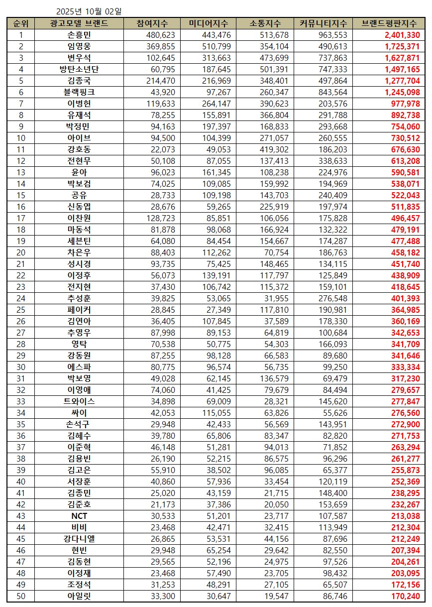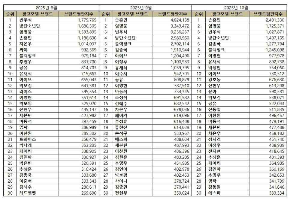 2025년 10월 광고모델 브랜드평판 30위 순위는 손흥민, 임영웅, 변우석, 방탄소년단, 김종국, 블랙핑크, 이병헌, 유재석, 박정민, 아이브, 강호동, 전현무, 윤아, 박보검, 공유, 신동엽, 이찬원, 마동석, 세븐틴, 차은우, 성시경, 이정후, 전지현, 추성훈, 페이커, 김연아, 추영우, 영탁, 강동원, 에스파 순으로 분석됐다.