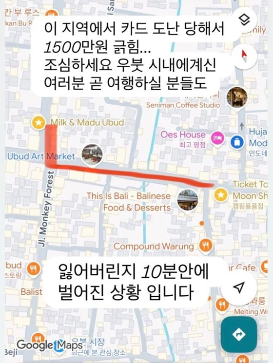 전혜빈은 "조심하세요. 우붓 시내에 계신 여러분, 곧 여행하실 분들도"라며 "잃어버린 지 10분 안에 벌어진 일"이라고 전했다.