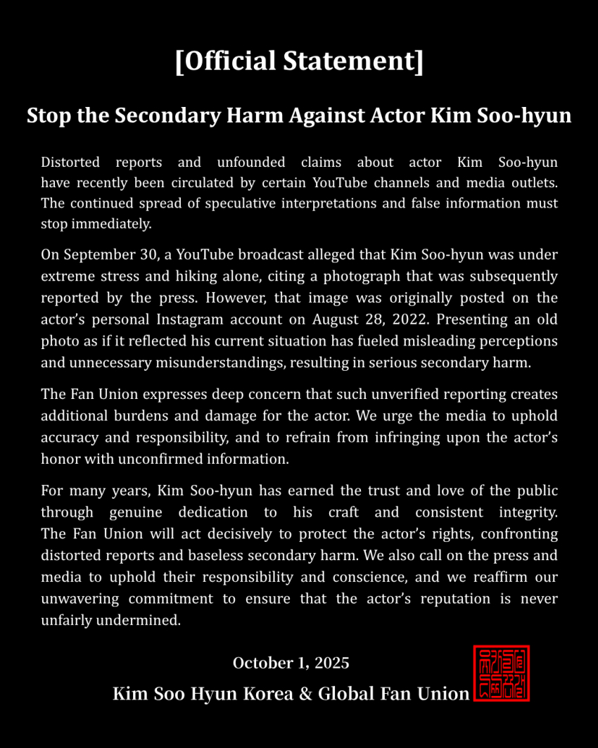 김수현 팬덤은 "9월 30일 한 유튜브 방송에서는 김수현 배우가 극도의 스트레스를 받고 홀로 등산을 하고 있다는 취지의 내용을 전하며 사진을 인용했고, 그 내용이 언론에도 보도됐다. 그러나 해당 사진은 2022년 8월 28일 배우 본인의 인스타그램에 게시된 과거 사진이다. 과거 사진이 최근 상황처럼 사용되면서, 잘못된 인식과 불필요한 오해가 확산돼 심각한 2차 가해로 이어지고 있다"고 했다.
