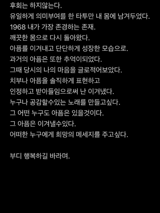 나나는 "1968 내가 가장 존경하는 존재. 깨끗한 몸으로 다시 돌아왔다"라며 "아픔을 이겨내고 단단하게 성장한 모습으로, 과거의 아픔은 또한 추억이 됐다"라고 밝혔다.