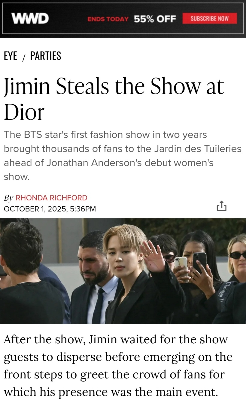 패션매거진 WWD는 '지민, 디올 쇼를 스틸하다(Jimin Steals the Show at Dior)'라는 기사에서 지민이 조나단 앤더슨의 여성복 데뷔쇼를 앞두고 수천 명의 팬들을 튈르리 정원으로 끌어들였다고 소개, '쇼가 끝난 후 지민은 게스트들이 해산될 때까지 기다린 후 앞 계단으로 나와 팬들을 맞이했는데, 그의 존재가 메인 이벤트였다'고 전했다.