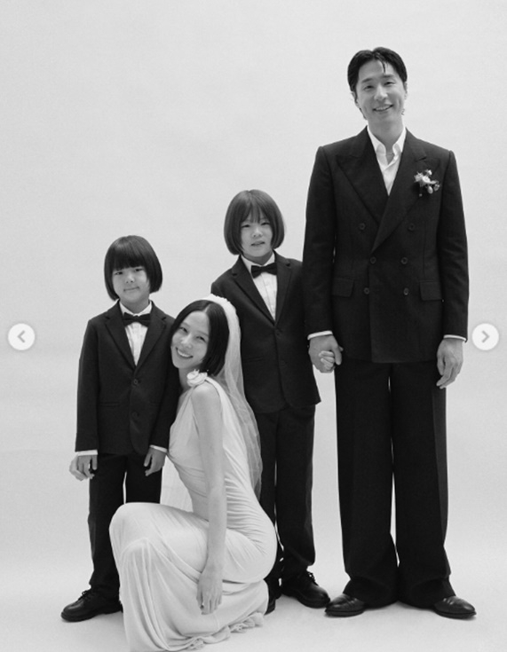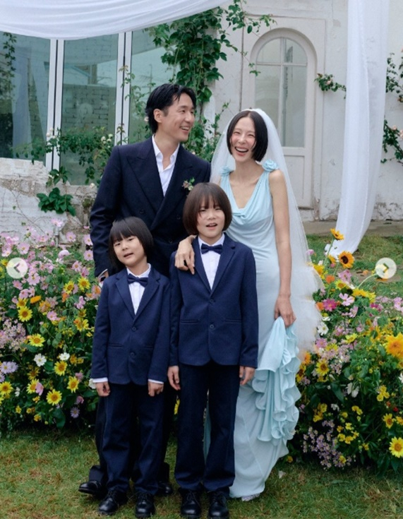 공개된 사진 속 김나영은 웨딩드레스에 흰색 면사포를 쓰고 수트를 입은 마이큐와 환한 미소를 짓고 있다. 김나영의 두 아들도 함께 결혼식 사진을 찍으며 행복한 가족의 탄생을 알렸다. 오랜 시간 공개 연애를 해 온 두 사람은 자연스러운 부부의 모습을 보여주고 있다.