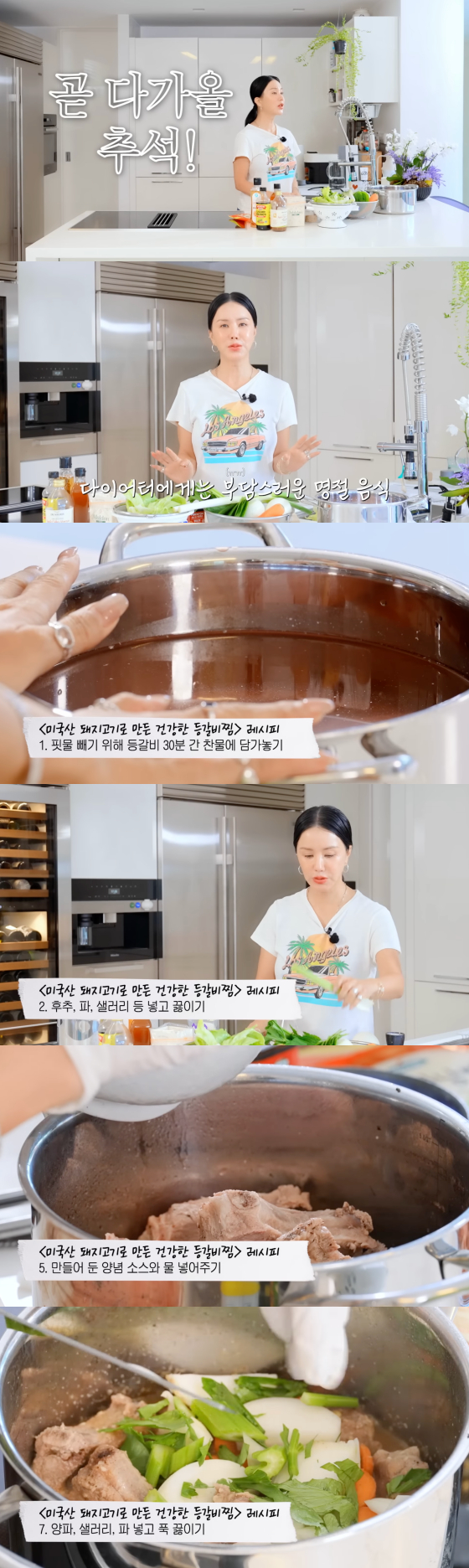 요리 영상에서 엄정화는 등갈비찜을 만들 때 저당 간장소스, 알룰로스 등 저당 소스를 준비했다. 이어 핏물을 빼기 위해 등갈비를 30분간 찬물에 담가놓은 뒤 후추, 파, 샐러리 등을 넣고 끓였다.