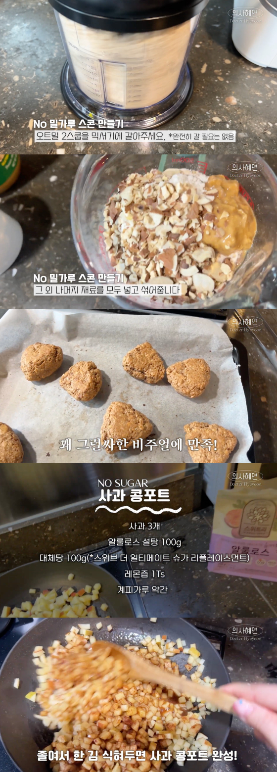 설탕을 넣지 않은 사과 콩포트 레시피도 눈길을 끌었다. 사과, 알룰로스 설탕, 대체당, 레몬즙, 계피가루를 넣고 사과에서 물이 나올 때까지 중불에 잘 볶아주면 완성이다.