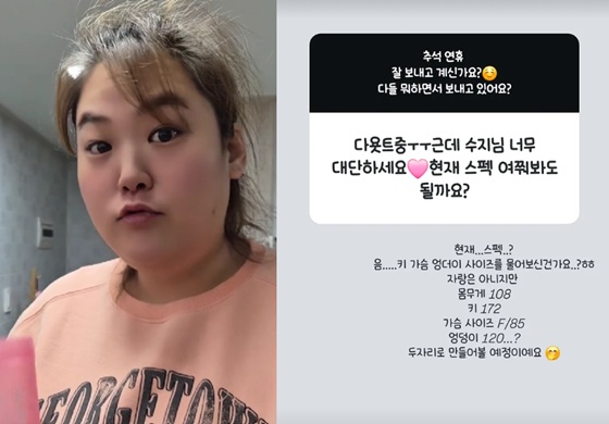 이에 박수지 씨는 "현재 스펙? 음 키 가슴 엉덩이 사이즈를 물어보신 건가. 자랑은 아니지만 몸무게 108, 키 172, 가슴 사이즈 F/85, 엉덩이 120"이라며 "두 자리로 만들어 볼 예정"이라고 답했다.