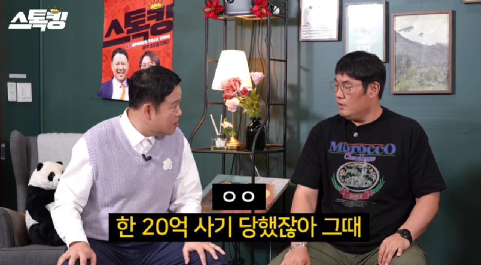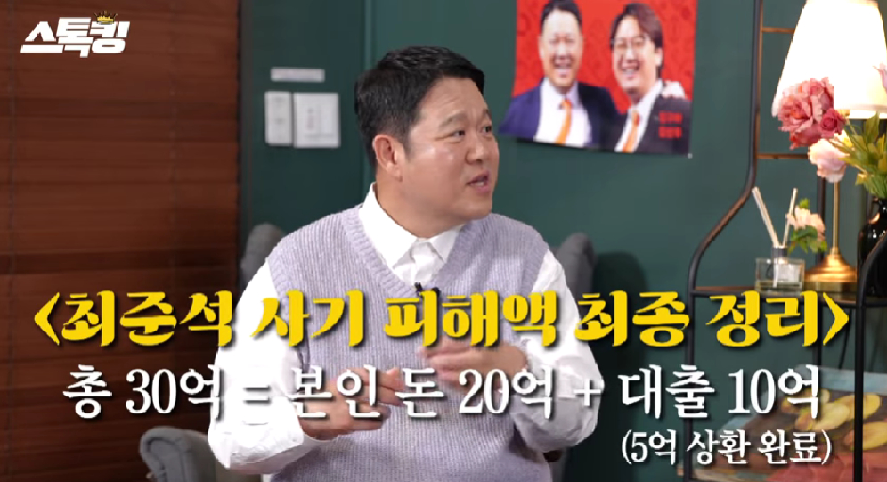 이어 문제의 발언에 대해 이혼하게 됐을 때 어떠할 지를 가정한 상황이었을 뿐이라고 해명하고 "20억 정도 사기를 당했다. 건물 쪽에 투자를 했다가 사기를 당했다. 실제로는 여러 명이 더 있어서 수백억대 사기 사건이었다"라며 "와이프는 당연히 반대였다. 와이프는 사실 그때 아파트에 관심이 있어서 아파트 3채를 사면 훨씬 더 좋을 것 같다고 했다. 와이프 먈을 들었으면 3~4배는 더 뛰었을 것"이라고 아쉬워했다.