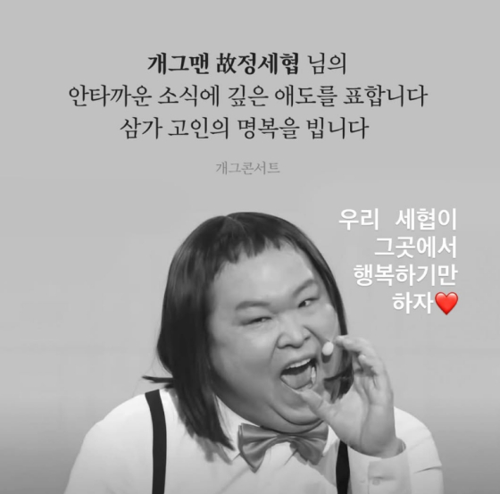 이와 함께 공개된 흑백 사진에는 고 정세협이 KBS 2TV '개그콘서트' 무대에서 코너를 펼치는 모습이 담겨 먹먹함을 자아냈다.