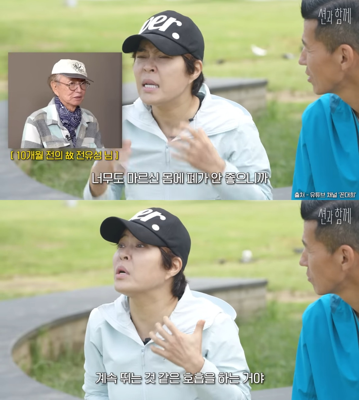 조혜련은 고 전유성을 언급하며 "너무 마른 몸에 폐가 안 좋으니까 호흡기를 연결했는데 정말 100m 달리기 뛰는 거 같은 호흡으로 뛰더라"고 털어놨다.