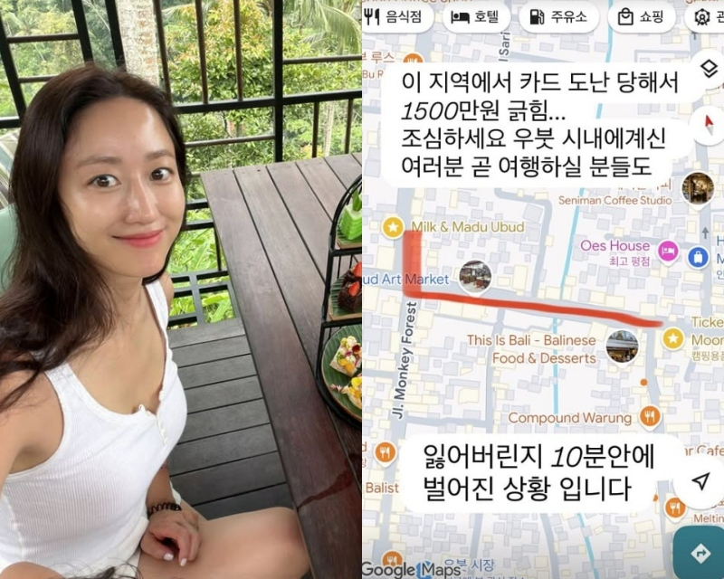 이날 전혜빈은 발리의 대표 관광지인 우붓의 지도 사진과 함께 "이 지역에서 카드 도난 당해서 1500만 원 긁힘. 조심하세요. 우붓 시내에 계신 여러분. 곧 여행하실 분들도. 잃어버린지 10분 안에 벌어진 상황"이라고 말했다.