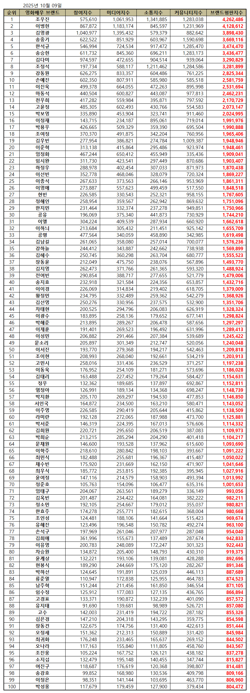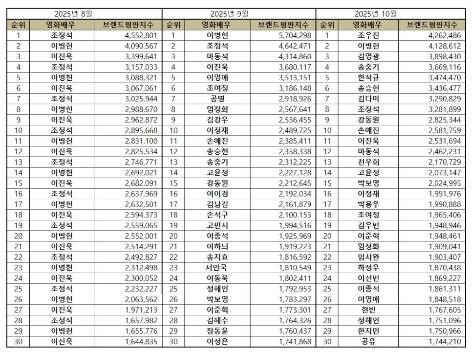 2025년 10월 영화배우 브랜드평판 30위 순위는 조우진, 이병헌, 김영광, 송중기, 한석규, 송승헌, 김다미, 조정석, 강동원, 손예진, 이진욱, 마동석, 천우희, 고윤정, 박보영, 이정재, 박용우, 조여정, 김우빈, 이준혁, 엄정화, 임시완, 하정우, 이선빈, 이종석, 이영애, 현빈, 정해인, 한지민, 공유 순이었다.