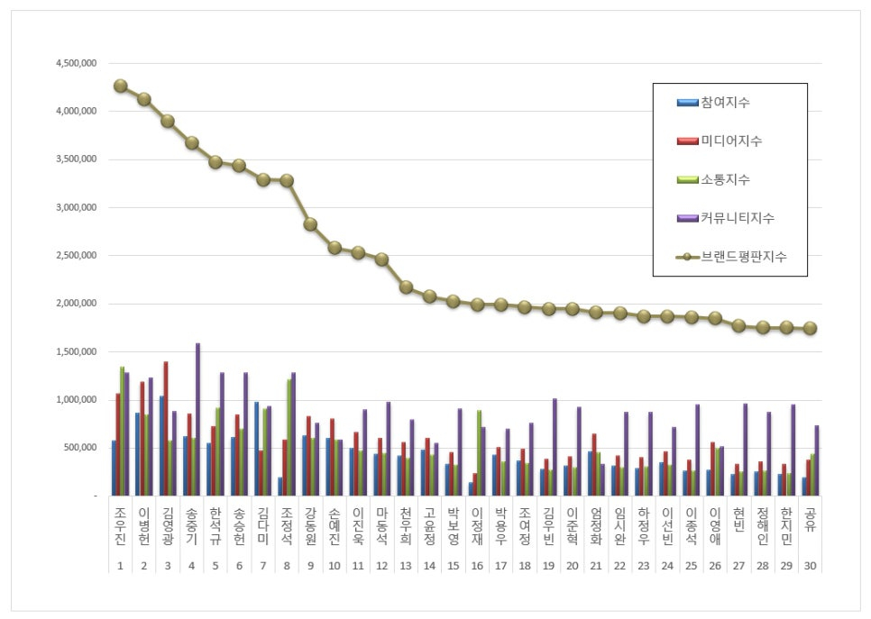 4위, 송중기 브랜드는 참여지수 622,522 미디어지수 851,929 소통지수 603,967 커뮤니티지수 1,590,698이 되면서 브랜드평판지수 3,669,116으로 분석됐다.