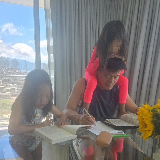 공개한 사진엔 박진영이 성경 필사 중인 모습이 담겼다. 그의 옆으론 큰딸이 독서에 심취, 훈훈함을 자아낸 동시에 둘째 딸은 아빠의 목마를 탄 채 여유를 방해하는 자태로 폭소를 유발했다.