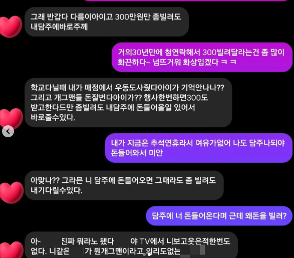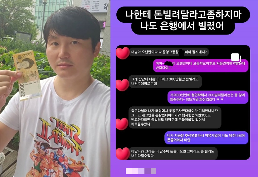 공개된 대화에 따르면 김대범 동창 A씨는 김대범에게 "다름이 아니고 300만 원 만 좀 빌려달라. 내가 다음 주에 바로 주겠다"라고 전했다.