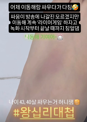 김희철은 "나이 43, 40살 싸우는거 허니잼 #왕십리대첩"이라고 덧붙였다.