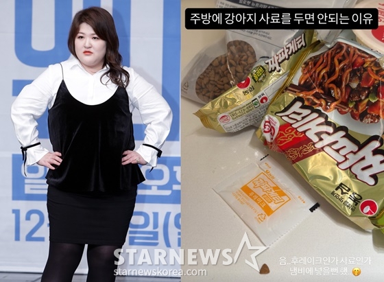 이국주는 강아지 사료를 짜장라면 재료와 혼동했다며 "음 후레이크인가 사료인가. 냄비에 넣을 뻔"이라고 밝혔다.