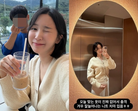 초아는 또 "오늘 맞는 옷이 진짜 없어서 충격. 겨우 잘 늘어나는 니트 치마 입음"이라며 볼록한 배를 공개했다. 초아는 배를 감싼 채 환한 미소를 지었다.