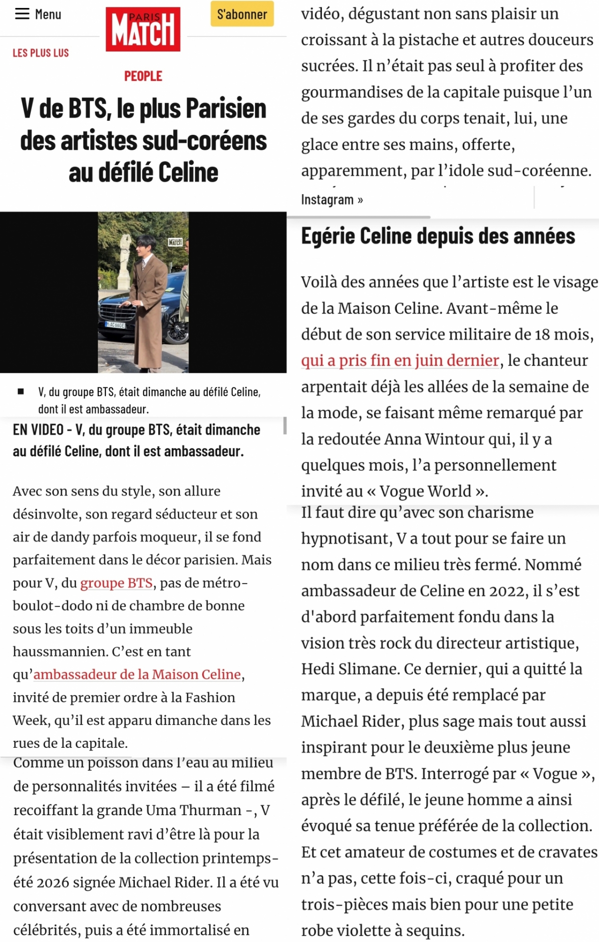 매체는 뷔가 셀린느의 뮤즈이며 셀린느의 얼굴이라고 설명하고 "군 입대 전에도 이미 패션 위크에서 활발하게 활동했으며, 몇 달 전에는 안나 윈투어가 '보그 월드'에 직접 초대했다"는 사실도 알렸다.