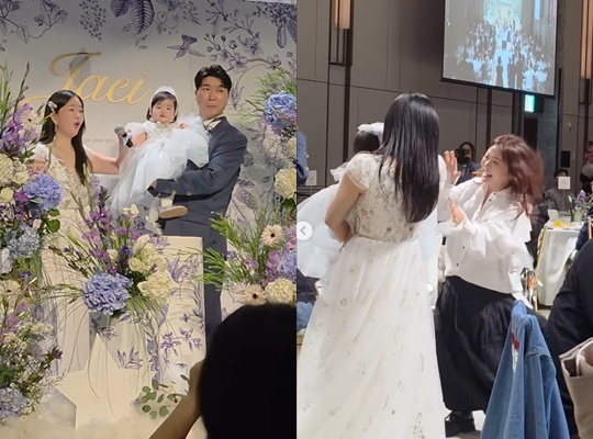 이날 돌잔치에서 드레스와 수트를 입은 김다예 박수홍 부부는 드레스 입은 재이를 안고 행복한 모습이다.