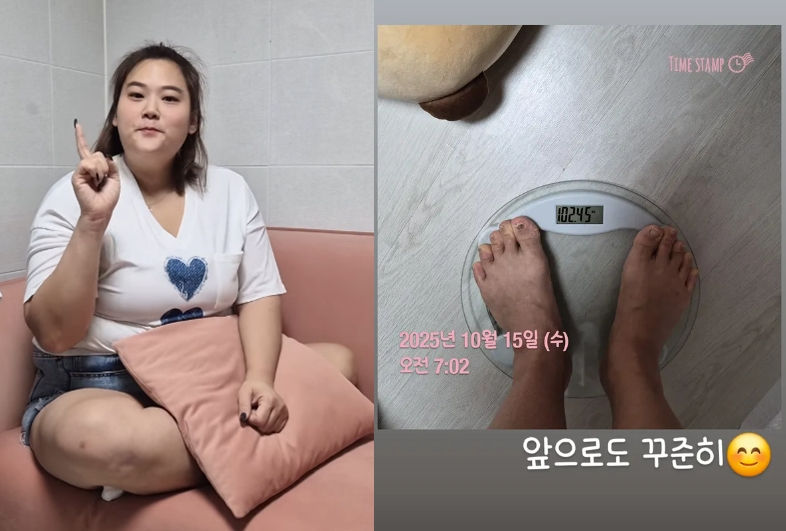 박수지는 15일 "앞으로도 꾸준히"라는 문구와 함께 102.45kg가 찍힌 체중계를 공개하며 다이어트 근황을 알렸다.