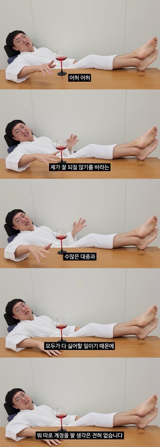 이날 목욕 가운 차림의 충주맨은 와인잔을 들고 의자에 반쯤 누운 자세로 카메라 앞에 등장했다.