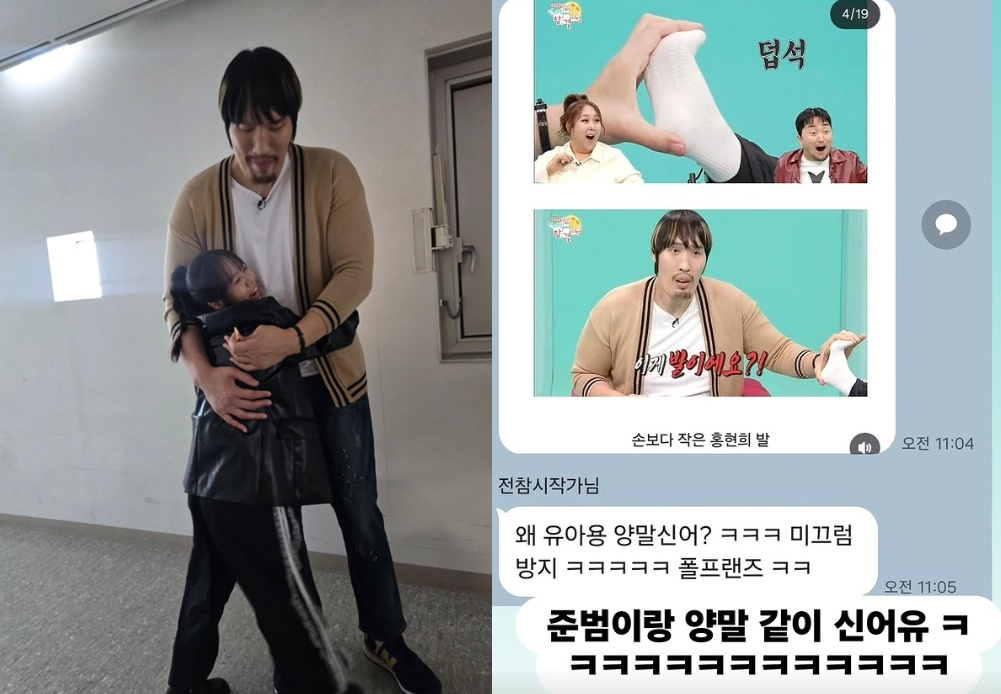 이에 작가는 홍현희에게 "왜 유아용 양말 신어?ㅋㅋㅋ 미끄럼 방지 ㅋㅋㅋㅋ"라고 말했고 홍현희는 "준범이랑 양말 같이 신어요 ㅋㅋㅋㅋㅋ"라고 답했다.